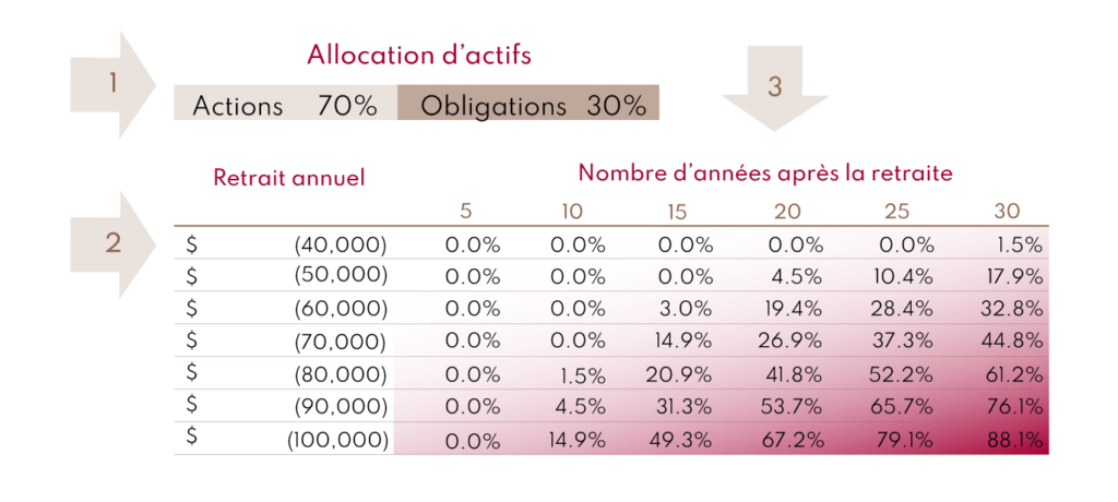 Nous avons décidé de nous y prendre autrement pour répondre à la question. C’est-à-dire que nous nous appuierons sur les rendements historiques des actions et des obligations au cours des presque 100 dernières années, puis nous allons simuler une multitude de périodes de 30 ans, pour finalement analyser les résultats et en extrapoler la probabilité de manquer d’argent en fonction d’un certain montant de dépenses annuelles. Non seulement les résultats empiriques sont réalistes, mais nous estimons aussi qu’il est plus approprié de les exprimer en termes de probabilité concernant des événements futurs. Prenons l’exemple d’un investisseur de 65 ans disposant d’un capital initial de 1 000 000 $ et d’un total de dépenses de 40 000 $ par année indexé à l’inflation (par total, on entend toutes les dépenses, y compris les impôts à payer). Quelle est la probabilité que cet investisseur soit à court d’argent lorsqu’il atteindra l’âge de 80, 85, 90 ans?