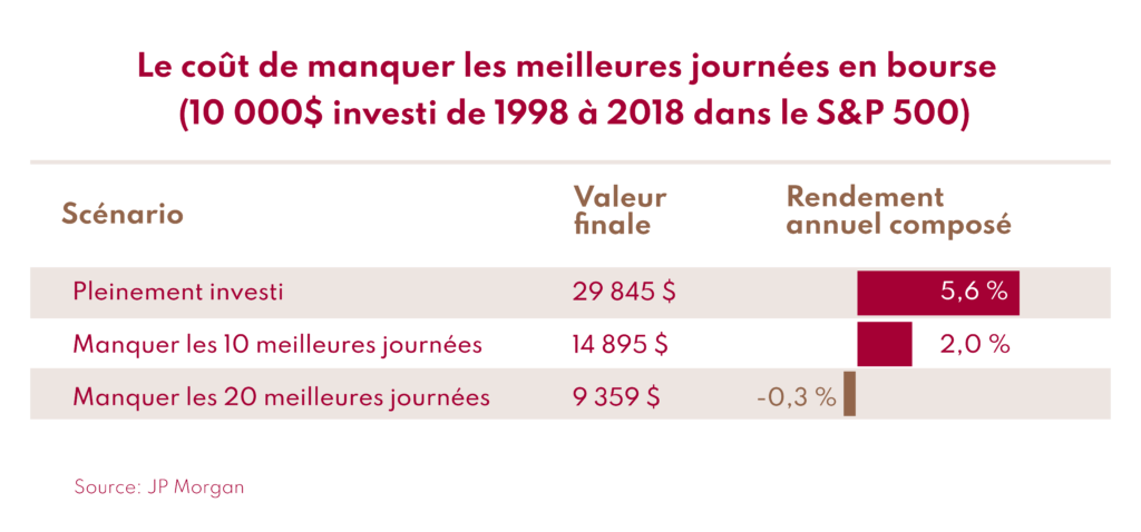 Une des études à ce sujet est celle de JP Morgan qui souligne qu’un investisseur ayant manqué seulement les 10 meilleures journées du marché entre 1998 et 2018 aurait vu son rendement diminuer de moitié par rapport à l’indice S&P 500 au cours de cette période.