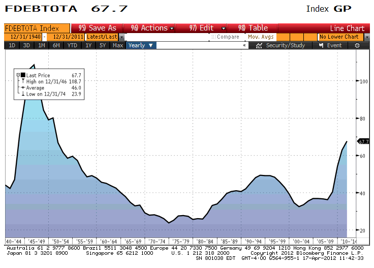 À la lecture du graphique, on peut voir que la dette se situe présentement à environ à 68% du niveau du PIB. Lors de la Deuxième Guerre Mondiale, elle est grimpée au-delà du ratio de 100% du PIB. La plupart des économistes ont déclaré que bien qu’il soit normal que la dette ait franchi la barre extrême des 100% du PIB en temps de guerre, le niveau d’aujourd’hui serait insoutenable puisque nous sommes en temps de paix.