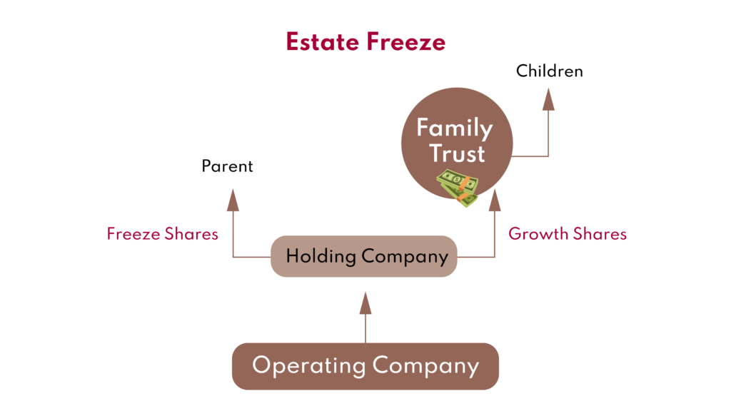 An estate freeze locks in the current value of a business owner’s interest, typically by exchanging common shares for fixed-value preferred shares, while directing all future growth to the next generation, often through a family trust. Because capital gains tax is calculated on appreciation, freezing the current value effectively caps the shareholder’s tax exposure at death and allows subsequent growth to accrue outside the estate.