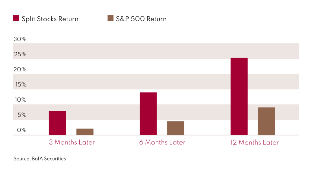 Indeed, if we examine the table below, we can see that since 1980, S&P 500 stocks that announced stock splits have outperformed the index by an average of 16 percentage points the following year.